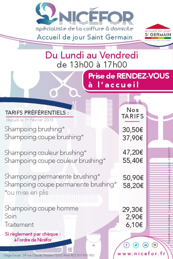 L'accueil de jour St Germain a établi un partenariat avec la Société Nicéfor qui met à disposition des coiffeurs et propose des tarifs préférentiels aux personnes inscrites à l'Accueil de jour. Pour en profiter, merci de nous en informer au 01 46 33 72 18 ou adj@accueilsaintgermain.com.